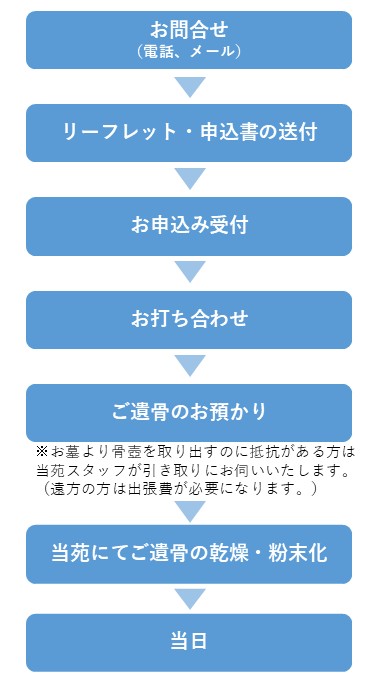 申込書を郵送にてお送りいただきましたら、当苑からご連絡いたしますので、そのときに手順と日程の確認をさせていただきます。